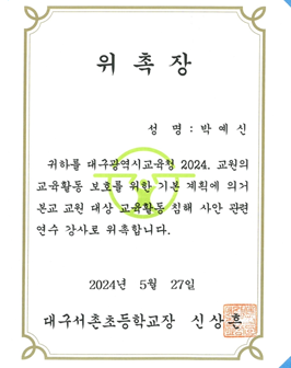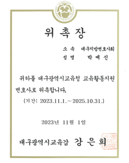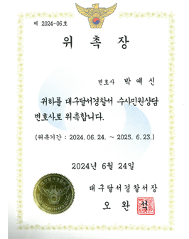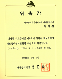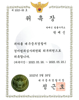 법인소개 인사말 오시는 길 변호사 소개 조이황 변호사 박예신 변호사 곽미경 변호사 김진석 변호사 백유송 변호사 업무분야 형사소송 의료소송 조세·행정 이혼·가사 부동산 민사소송 파산·회생 소액사건 성공사례 성공사례 JPK소식 JPK소식 1:1문의 실시간 전화상담053-754-7999 법인소개 인사말 오시는 길 변호사 소개 조이황 변호사 박예신 변호사 곽미경 변호사 김진석 변호사 백유송 변호사 업무분야 형사소송 의료소송 조세·행정 이혼·가사 부동산 민사소송 파산·회생 소액사건 성공사례 성공사례 JPK소식 JPK소식 1:1문의 LAW FIRM JPK 법무법인JPK 변호사 소개 전문성과 신뢰를 바탕으로, 최고의 법률 서비스를 제공합니다. 변호사 소개 법인소개 변호사 소개 업무분야 성공사례 JPK소식 박예신 변호사 조이황 변호사 박예신 변호사 곽미경 변호사 김진석 변호사 백유송 변호사 약력 - 경북대학교 치과대학 졸업 - 영남대학교 법학전문대학원 졸업 - 경북대학교 치과대학 외래교수 - 대한치과의사협회 고문변호사 - 대구치과의사회 대외협력이사 - 한국의료분쟁조정중재원 환자대변인 - 대구광역시 의료기관개설위원회 위원 - 대구광역시 의료급여심의위원회 위원 - 대구광역시 교육청 교육활동지원 변호사 위촉장