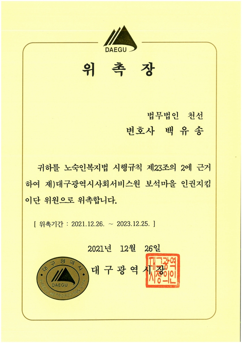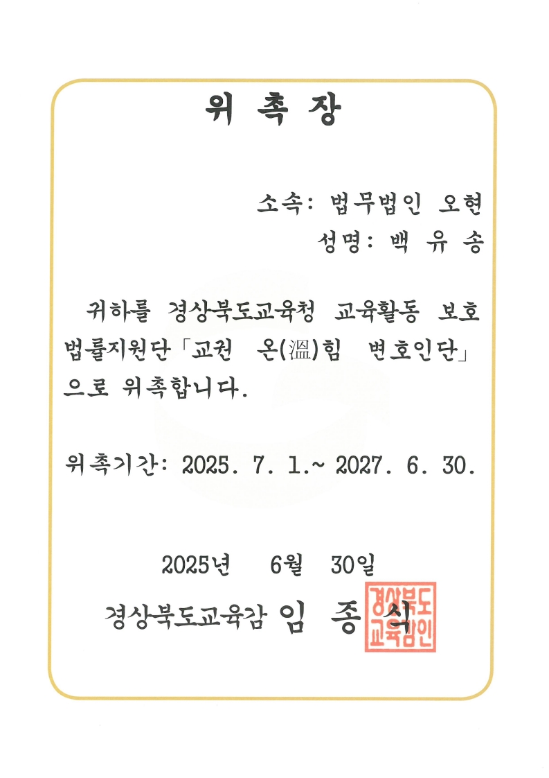 법인소개 인사말 오시는 길 변호사 소개 조이황 변호사 박예신 변호사 곽미경 변호사 김진석 변호사 백유송 변호사 업무분야 형사소송 의료소송 조세·행정 이혼·가사 부동산 민사소송 파산·회생 소액사건 성공사례 성공사례 JPK소식 JPK소식 1:1문의 실시간 전화상담053-754-7999 법인소개 인사말 오시는 길 변호사 소개 조이황 변호사 박예신 변호사 곽미경 변호사 김진석 변호사 백유송 변호사 업무분야 형사소송 의료소송 조세·행정 이혼·가사 부동산 민사소송 파산·회생 소액사건 성공사례 성공사례 JPK소식 JPK소식 1:1문의 LAW FIRM JPK 법무법인JPK 변호사 소개 전문성과 신뢰를 바탕으로, 최고의 법률 서비스를 제공합니다. 변호사 소개 법인소개 변호사 소개 업무분야 성공사례 JPK소식 백유송 변호사 조이황 변호사 박예신 변호사 곽미경 변호사 김진석 변호사 백유송 변호사 약력 - 경북대학교 법과대학 - 전) 법무법인 어울림 - 전) 법무법인 대륜 - 전) 법무법인 오현 - 전) 대구광역시 동부교육지원청 학교폭력심의센터 변호사/심의위원회 내부위원 - 전) 대구광역시 보석마을 인권위원회 위원 - 현) 법무법인 JPK 위촉장